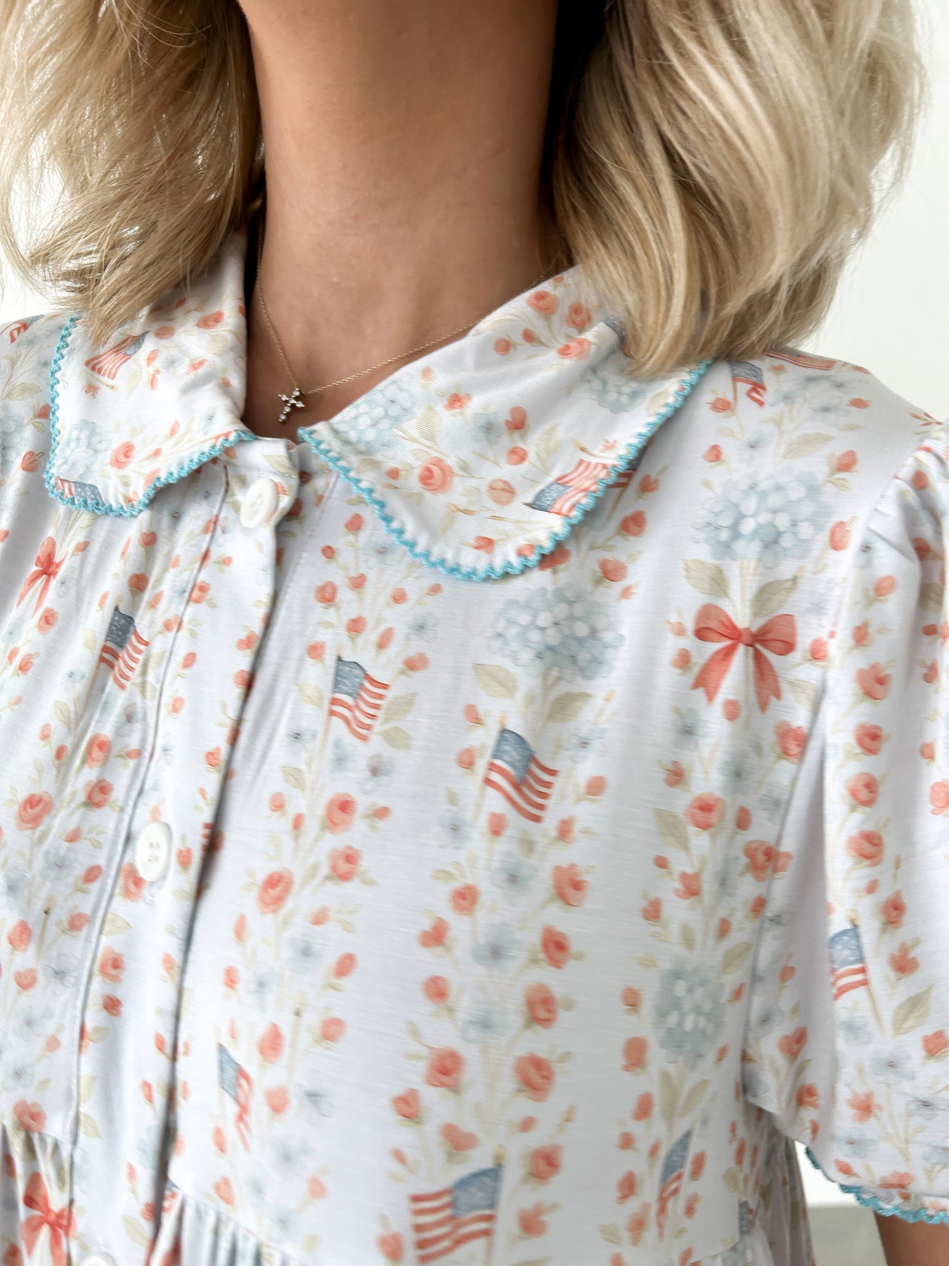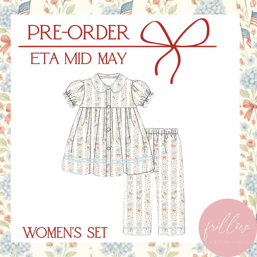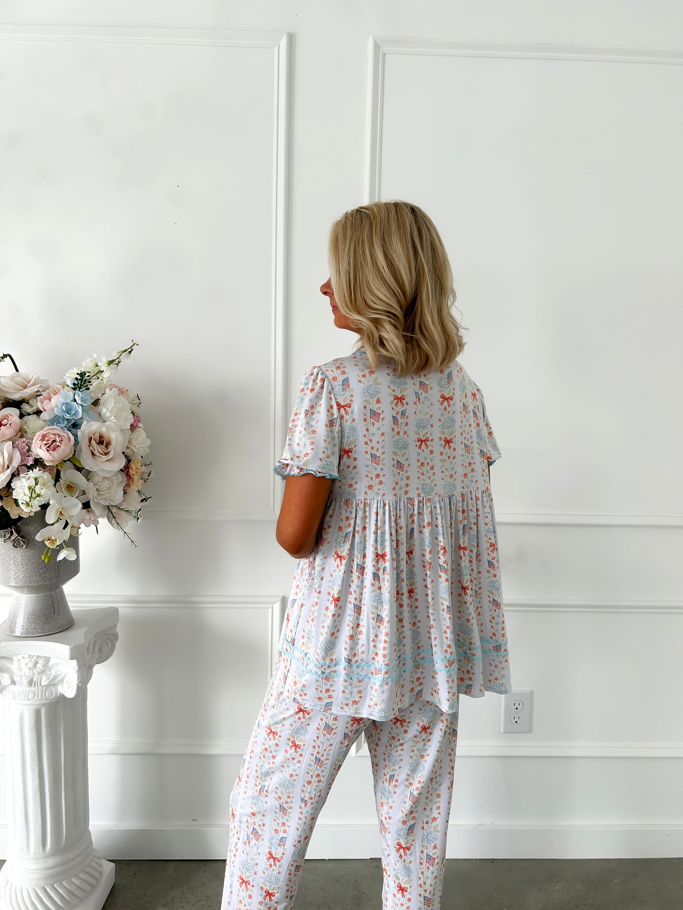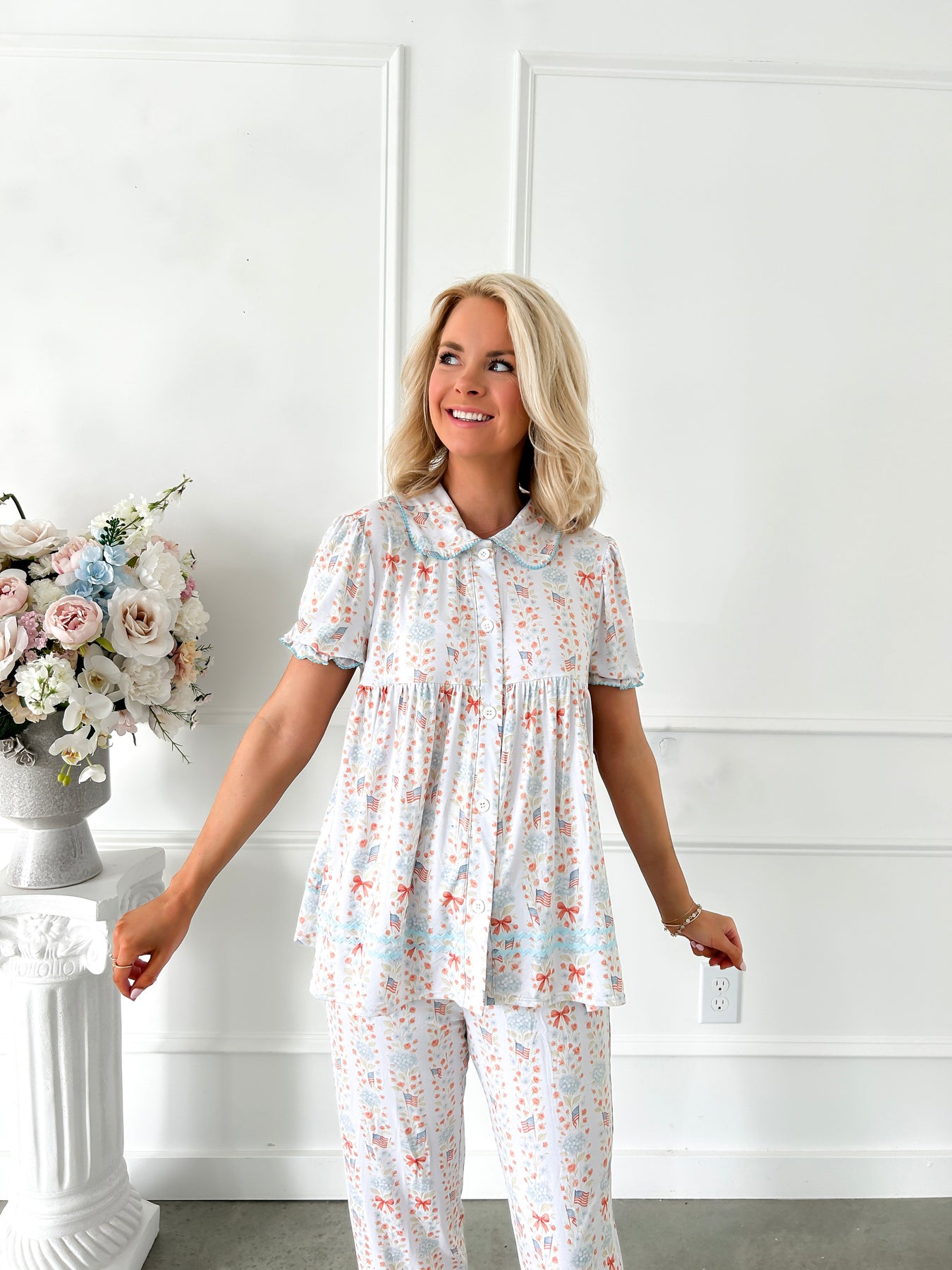 Slip into comfort with our Liberty and Lace Women's Pant Set—the perfect blend of cozy and chic! This delightful two-piece features a floral button-down short-sleeve top paired with relaxed-fit pants in crisp red, white and blue. Whether you're lounging at home or catching some z's, you'll love the soft fabrics and charming details that make bedtime feel like a style moment. Sweet dreams never looked so good! Available for preorder with an estimated delivery in mid-May.