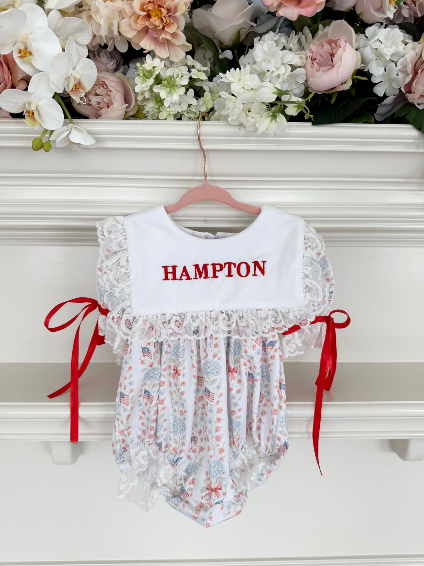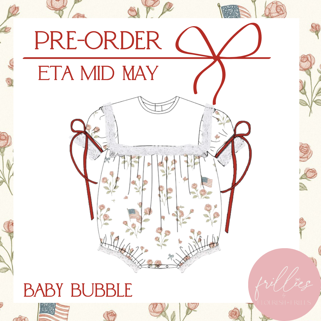 Celebrate patriotic style with this charming bubble romper featuring a playful red, white, and blue design. Delicate lace trim frames the neckline and armholes, while cheerful red bows add an extra touch of whimsy. Perfect for little ones who love to stand out, this bubble silhouette offers comfort and character in one adorable package. Available for preorder with delivery expected mid-May.
