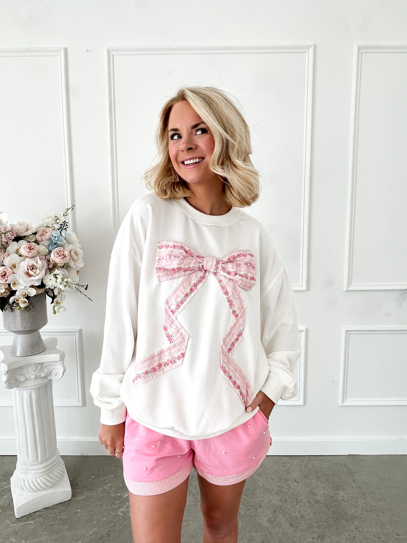 Wrap yourself in cozy comfort with this charming white sweatshirt, adorned with delicate floral bow appliqués that add a touch of whimsy to your everyday wardrobe. Perfect for layering or wearing solo, this soft top brings a playful elegance to casual outfits. Whether you're lounging at home or stepping out for a relaxed day, this sweet sweatshirt pairs effortlessly with your favorite jeans or skirts for an effortlessly put-together look.