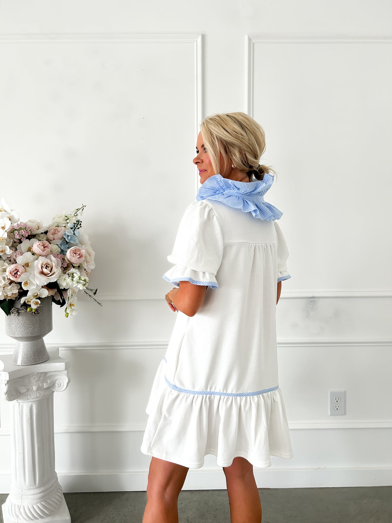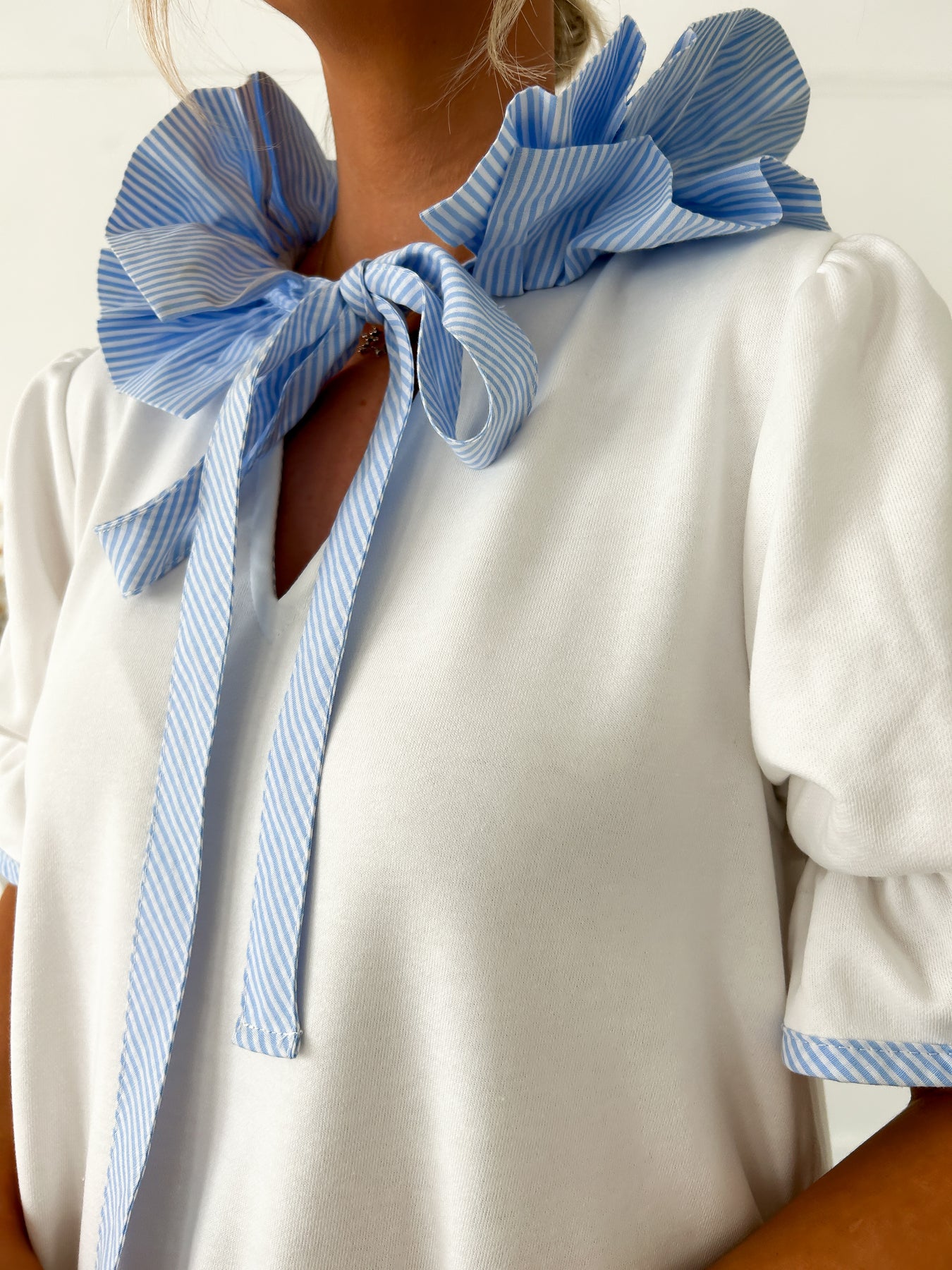 Twirl into spring with this charming striped terry dress featuring a statement ruffle collar that's equal parts fun and fabulous. The crisp white and blue palette keeps things fresh and versatile, while the plush terry fabric offers cozy comfort all day long. Perfect for those who love to make an entrance—this dress combines playful style with practical wear that keeps up with active adventures.